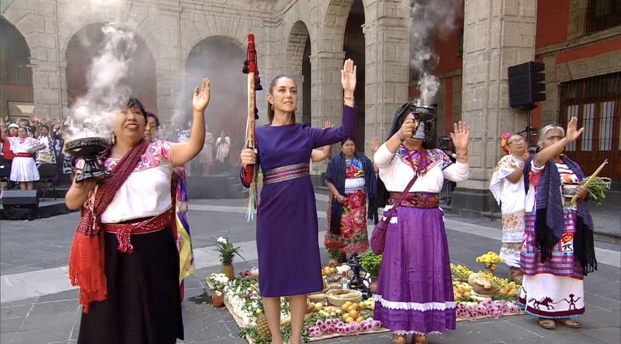 “Se lleva a cabo el ritual de limpia, purificación, así como la invocación de los cuatro rumbos y el centro del universo. De igual manera se hace la entrega del bastón de mando por parte de autoridades indígenas a la doctora Claudia Sheinbaum Pardo, presidenta de los Estados Unidos Mexicanos”, se informó al inicio del acto.