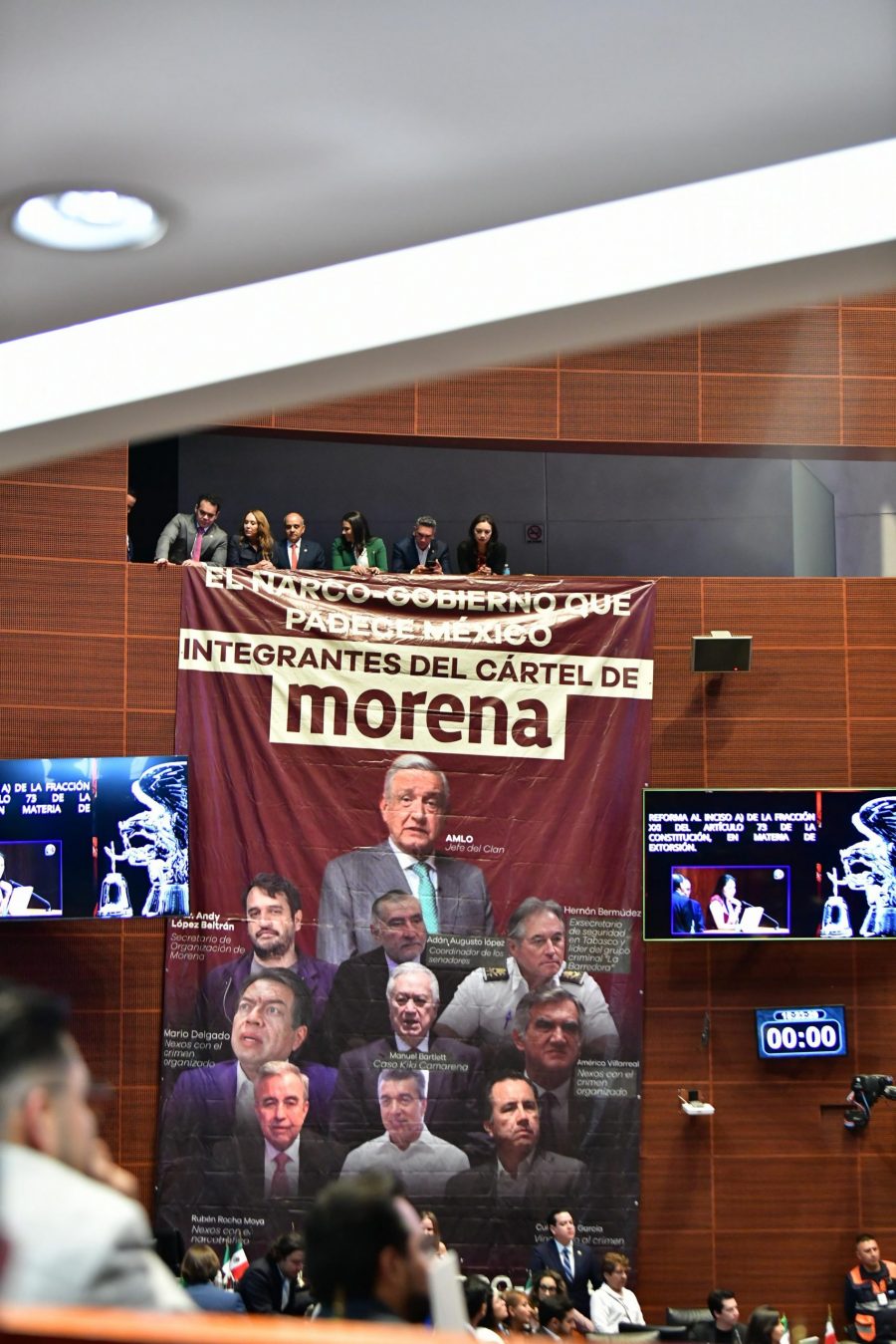“¡Nos quieren callar! Así actúan los narcopolíticos de MORENA, arrebatando la lona en la que exhibimos su corrupción y complicidad con el crimen organizado”, afirmó.