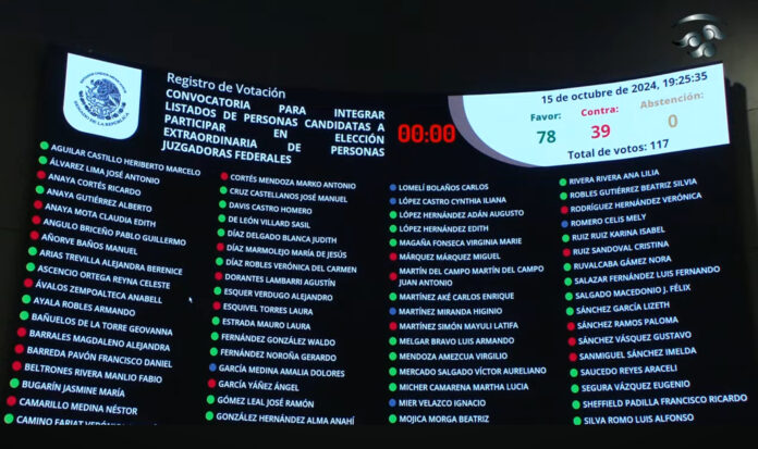 México, 15 de octubre.- El Senado aprobó con 78 votos en pro y 39 en contra la convocatoria de las personas juzgadoras que ocuparán los cargos de ministras y ministros de la Suprema Corte de Justicia de la Nación; magistradas y magistrados de las salas Superior y Regionales del Tribunal Electoral del Poder Judicial de la Federación; magistradas y magistrados del Tribunal de Disciplina Judicial; magistradas y magistrados de Circuito y juezas y jueces de Distrito del Poder Judicial de la Federación.