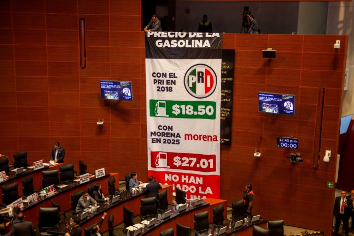 Los senadores del PRI desplegaron una manta en el Salón de Plenos, para hacer referencia que cuando ese partido gobernó México en 2018, la gasolina costaba 18.50 pesos y con Morena en 2025 es de 27.01 pesos.