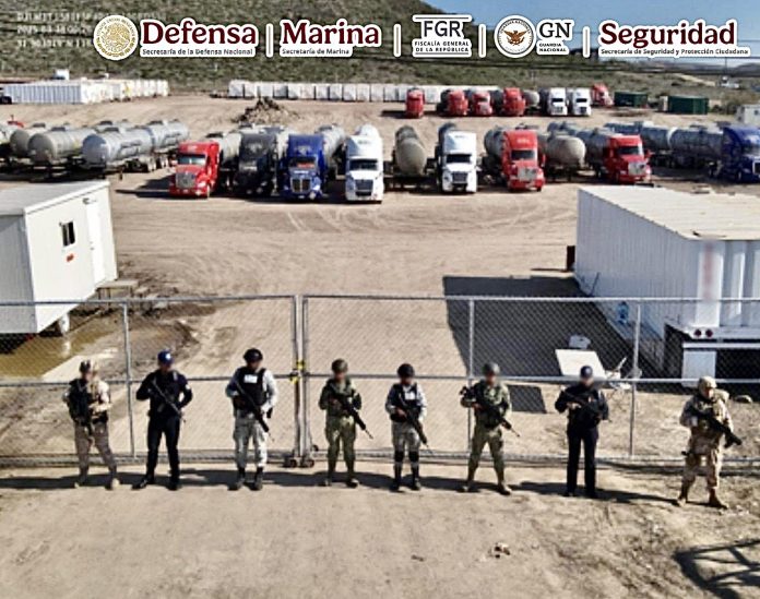 Con la información obtenida se realizó un despliegue coordinado y en el lugar se hallaron 100 cajas tipo contenedor con hidrocarburo de 72 mil 800 litros de capacidad cada una, 46 remolques tipo cisterna, cada uno con 31 mil litros de hidrocarburo, 19 tractocamiones de diferentes modelos, 12 motobombas de diferentes capacidades, dos remolques tipo oficina, una cisterna con 4 mil litros de urea, con un estimado de siete millones 944 mil litros de hidrocarburo.