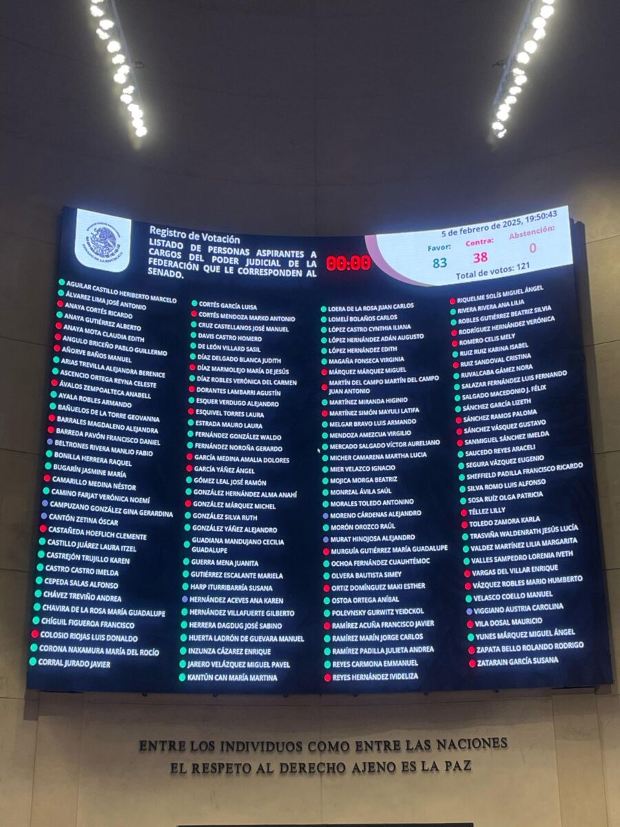 México, 5 de febrero.- En medio de un áspero debate, el pleno del Senado aprobó con 83 votos a favor y 38 en contra de la oposición, los listados del Comité de Evaluación del Poder Legislativo, que contienen 870 candidatas y candidatos a jueces, magistrados y ministros, que participarán en la elección del Poder Judicial del próximo 1 de junio.