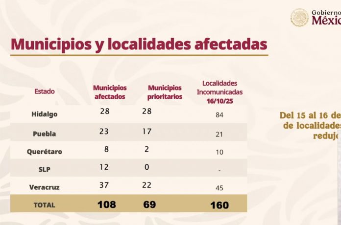 En Hidalgo, los municipios dañados pasaron de 26 a 28, y las localidades incomunicadas se redujeron de 111 a 84; en Puebla, de 29 a 21; mientras que en Querétaro, tras un deslave importante, el número aumentó de tres a 10.
