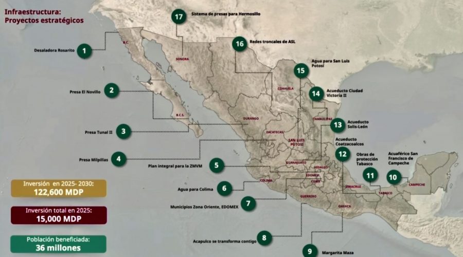 México, 4 de septiembre.- El director de la Comisión Nacional del Agua (Conagua), Efraín Morales López, informó que se encuentran en desarrollo 17 proyectos estratégicos de agua en distintas regiones del país, con el objetivo de garantizar el abasto de agua potable, mejorar los sistemas de drenaje y saneamiento, así como prevenir inundaciones en zonas vulnerables.