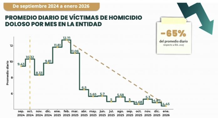 De acuerdo con las cifras oficiales, en febrero de 2025 el estado registraba un promedio de 12.71 homicidios dolosos diarios, mientras que en enero de 2026 la cifra descendió a 4.45 víctimas por día, lo que representa el nivel más bajo desde septiembre de 2024, inicio de la actual administración federal.