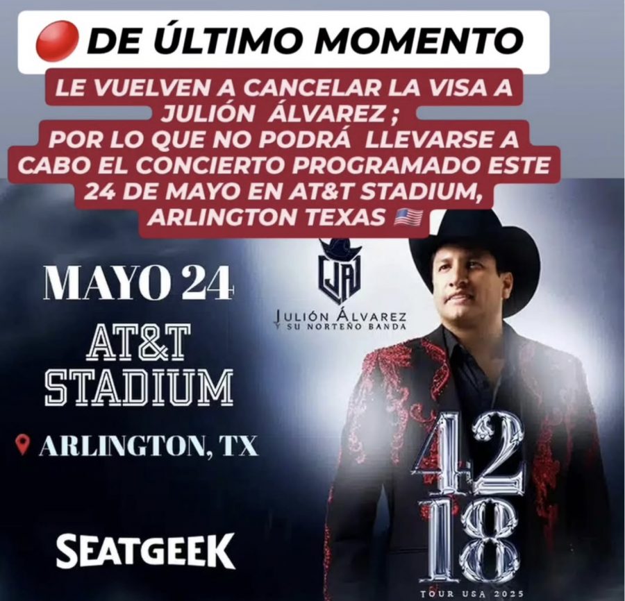 México, 23 de mayo.- El cantante de regional mexicano Julión Álvarez anunció la cancelación de su concierto programado para este sábado en Arlington, Texas, luego de que el gobierno de Estados Unidos revocara su visa de trabajo.