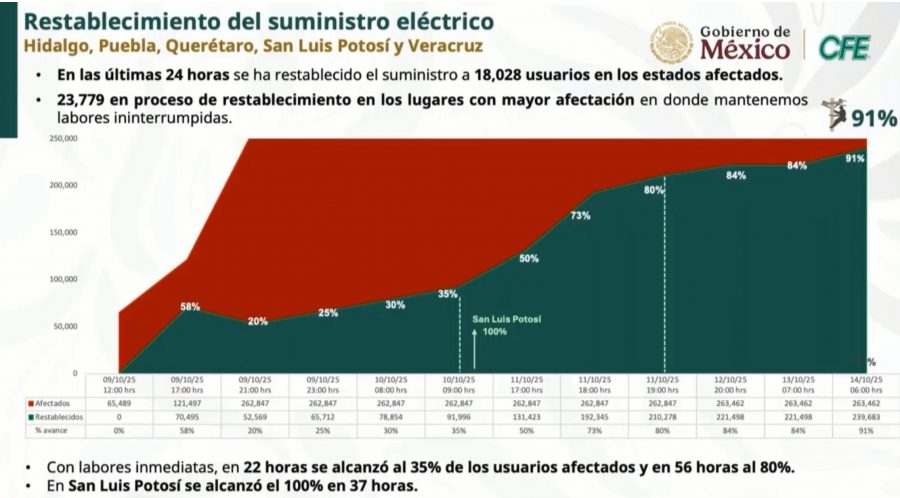 Hasta este martes, la CFE reporta un avance general del 91 por ciento en la rehabilitación del sistema eléctrico en las entidades afectadas y mantiene 51 frentes activos de trabajo en campo.