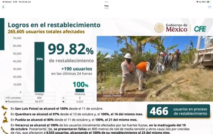 México, 24 de octubre.- La directora general de la Comisión Federal de Electricidad (CFE), Emilia Calleja, informó que el suministro eléctrico en las zonas afectadas por las fuertes lluvias en la región oriente del país presenta un avance del 99.82% en su restablecimiento, destacando que el estado de Veracruz ya recuperó al 100% el servicio y que los trabajos continúan en Hidalgo, donde aún permanecen 466 usuarios pendientes.