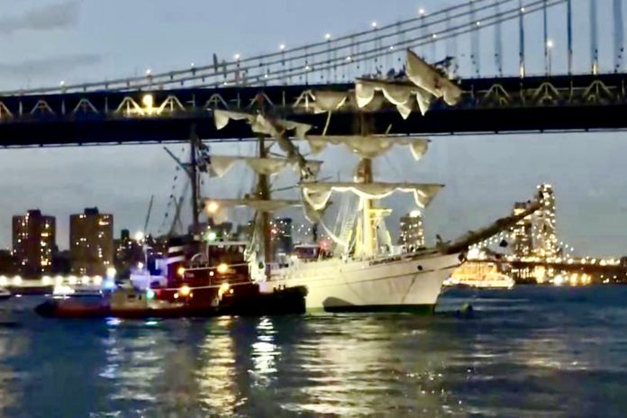 “Durante las maniobras de zarpe del Buque Escuela Velero Cuauhtémoc en el puerto de Nueva York, se registró un percance con el Puente de Brooklyn que provocó daños a la embarcación, impidiendo momentáneamente la continuación del crucero de instrucción.