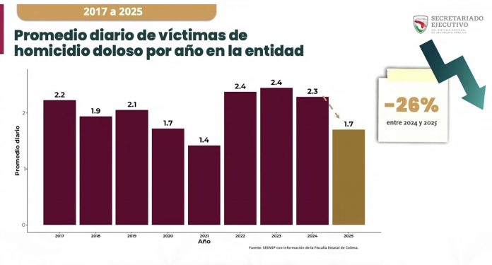 En el caso del municipio de Colima, la tendencia ha sido más estable. Al inicio de la administración el promedio diario era de 0.60 homicidios, mientras que en febrero de 2026 se ubicó en 0.54, lo que representa una reducción de 14 por ciento.