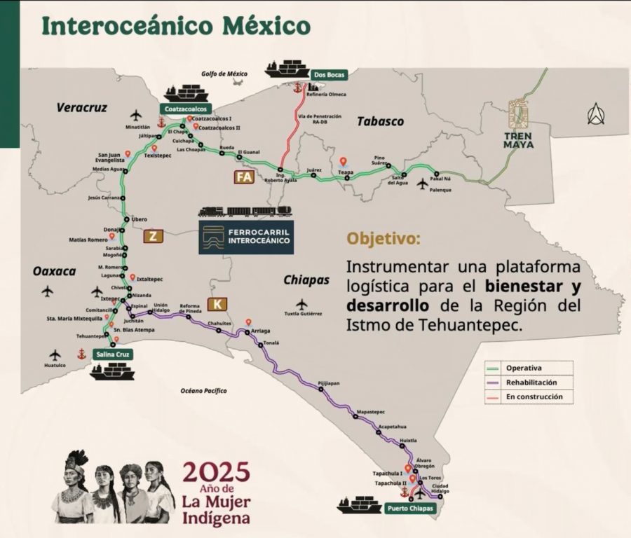 La rehabilitación de la línea K, de Ciudad Ixtepec a Ciudad Hidalgo, conectará el sistema ferroviario nacional con Centroamérica, específicamente en la frontera con Guatemala, enlazando con Puerto Chiapas.