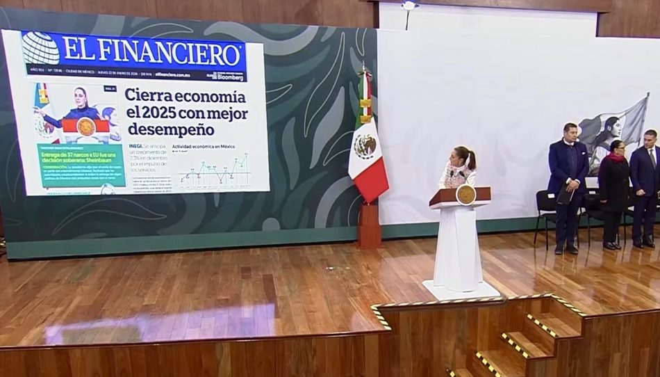Antes de iniciar su mensaje, la mandataria mostró la primera plana de un diario especializado, en la que se resalta que la economía mexicana cerrará el año con un mejor desempeño del previsto.