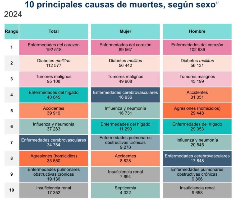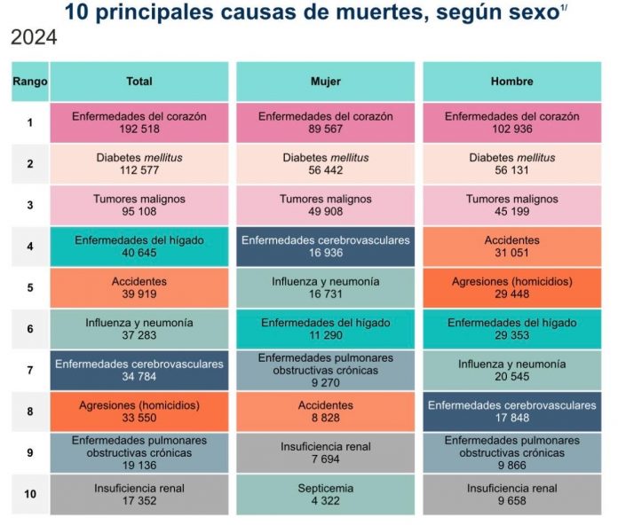 Las principales causas de muerte a nivel nacional fueron las enfermedades del corazón, seguidas por la diabetes mellitus, los tumores malignos, las enfermedades del hígado y los accidentes, de acuerdo con el informe del organismo.