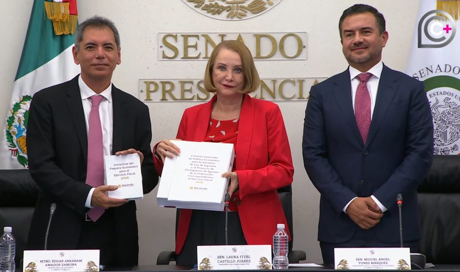 México, 9 de septiembre.- El secretario de Hacienda y Crédito Público, Édgar Amador Zamora, entregó al Senado de la República el Paquete Económico 2026, integrado por los Criterios Generales de Política Económica y la Iniciativa de Ley de Ingresos, así como el proyecto de Presupuesto de Egresos de la Federación.