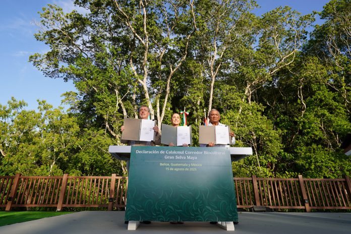 Calakmul, Campeche, 15 de agosto.— La presidenta de México, Claudia Sheinbaum Pardo, junto con el mandatario de Guatemala, Bernardo Arévalo, y el primer ministro de Belice, John Briceño, firmaron un acuerdo trilateral para la creación del Corredor Biocultural Gran Selva Maya Belice-Guatemala-México, con el propósito de preservar 5.7 millones de hectáreas del corazón de Mesoamérica.