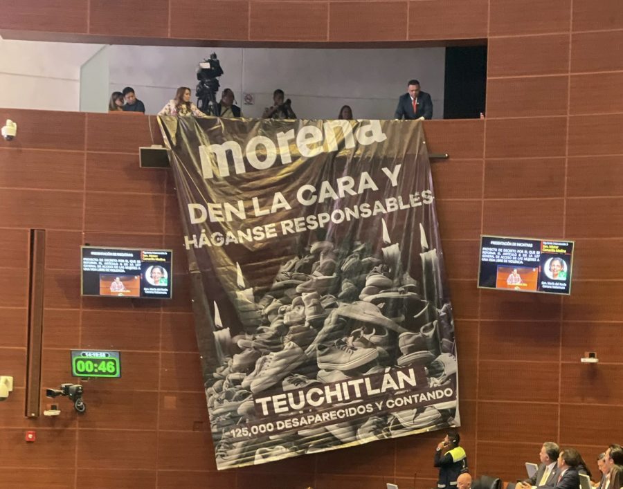 Una manta en color negro y letras blancas fue desplegada del lado derecho del Salón de Sesiones, justo enfrente de los escaños de los senadores Moreno.