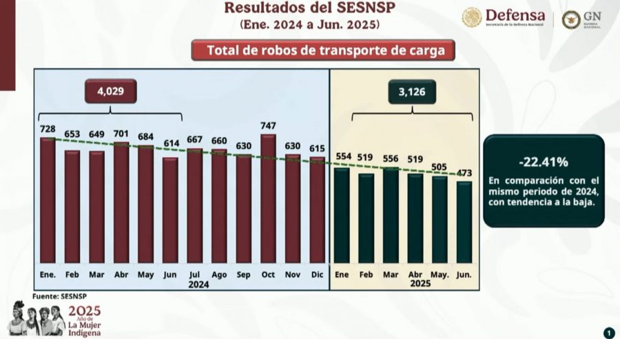 México, 22 de julio.- El comandante de la Guardia Nacional (GN), General de División Hernán Cortés, informó que se ha registrado una reducción del 22.41% en el robo a transporte en carreteras del país desde enero de este año.