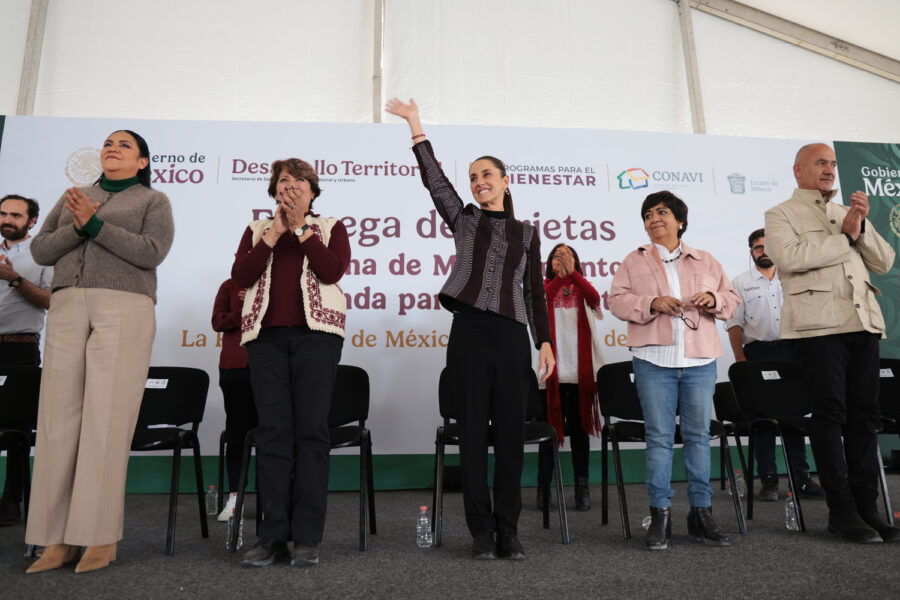 La doctora Claudia Sheinbaum Pardo, presidenta Constitucional de los Estados Unidos Mexicanos preside Entrega de Tarjetas - Programa de Mejoramiento de Vivienda para el Bienestar; La acompañan Carlos Torres Rosas, secretario técnico del Gabinete de la Presidencia y coordinador general de Programas para el Bienestar; Rodrigo Chávez Contreras, director generasl de la Comisión Nacional de Vivienda; Andrés Lajous Loaeza, director general de la Agencia Reguladora del Transporte Ferroviario (ARTF); Jaime Sánchez Cortés, beneficiario del Programa de Mejoramiento de Vivienda para el Bienestar; Ariadna Montiel Reyes, secretaria del Bienestar; Jabnely Maldonado Meza, vocal ejecutiva del Fondo de la Vivienda del Instituto de Seguridad y Servicios Sociales de los Trabajadores del Estado (Fovissste); Delfina Gómez Álvarez, gobernadora Constitucional del Estado de México; Leticia Ramírez Amaya, Coordinadora general de asuntos intergubernamentales y participación social; Edna Elena Vega Rangel, secretaria de Desarrollo Agrario, Territorial y Urbano; Jesús Antonio Esteva Medina, secretario de Infraestructura, Comunicaciones y Transportes; Alejandro Svarch Pérez, director general del IMSS Bienestar; Citlalli Hernández Mora, secretaria de las Mujeres; Blanca Estela Bautista Díaz, beneficiaria del Programa de Mejoramiento de Vivienda para el Bienestar; Efraín Morales López, director general de la Comisión Nacional del Agua (Conagua) y martha Guerrero Sánchez, presidenta municipal de La Paz.