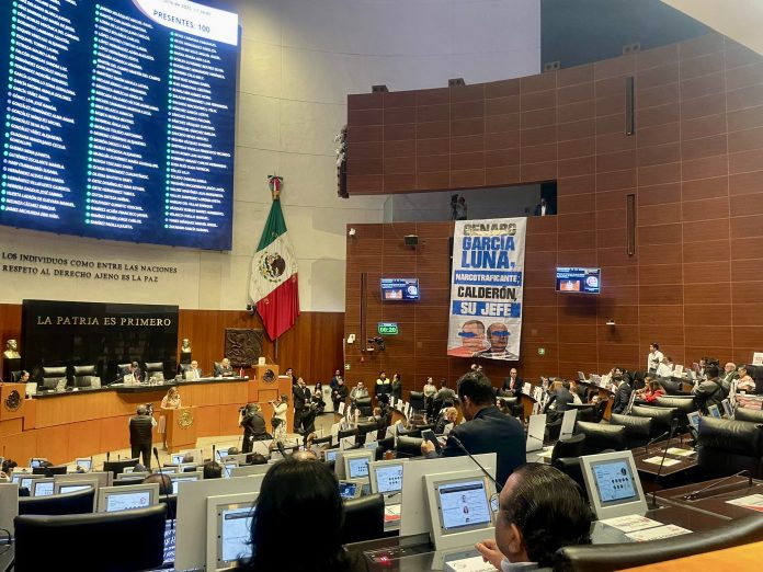 Durante la sesión, el debate trascendió lo legislativo para escalar al plano simbólico: la oposición desplegó en el pleno una manta con la leyenda “Gobierno Espía”, mientras los senadores de Morena respondieron con otra que decía “Genaro García Luna, narcotraficante. Calderón, su jefe”.