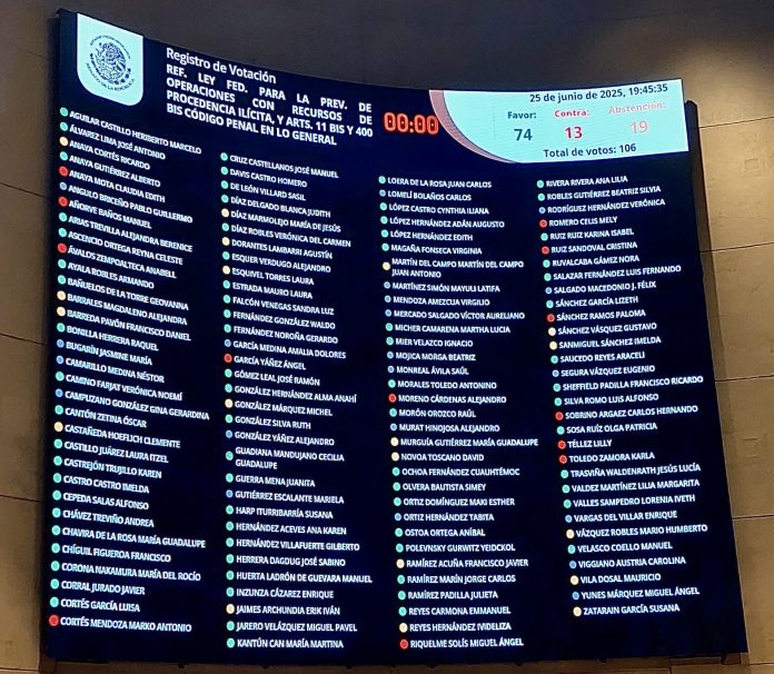 México, 215 de junio.- El pleno del Senado aprobó esta noche con 74 votos en pro, 13 en contra y 19 abstenciones un dictamen que reforma y deroga diversas disposiciones de la Ley Federal para la Prevención e Identificación de Operaciones con Recursos de Procedencia Ilícita, conocida como Ley Antilavado, así como modificaciones a los artículos 11 Bis y 400 Bis del Código Penal Federal.