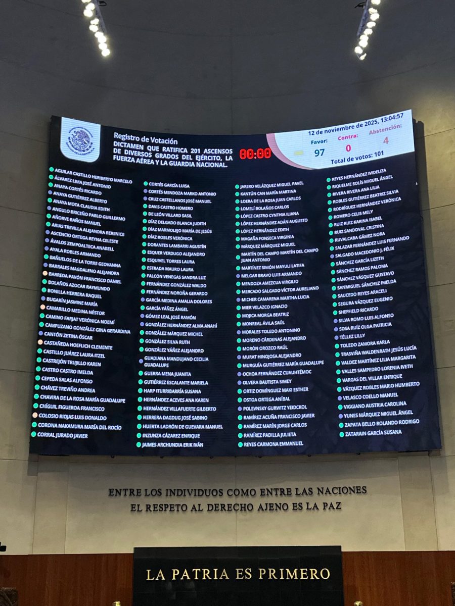 México, 12 de noviembre.- El pleno del Senado ratificó este miércoles, en sesión ordinaria, un total de 314 ascensos militares y navales correspondientes al Ejército, la Fuerza Aérea, la Guardia Nacional y la Secretaría de Marina Armada de México, en cumplimiento de las atribuciones constitucionales del Poder Legislativo.