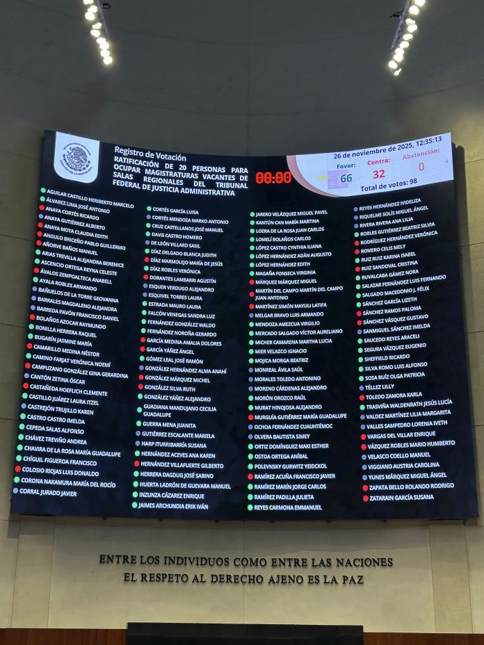 México, 26 de noviembre.- El pleno del Senado ratificó con 66 votos en pro y 32 en contra este miércoles a 20 candidatos para ocupar vacantes en las Salas Regionales del Tribunal Federal de Justicia Administrativa (TFJA), en una sesión marcada por tensos intercambios y acusaciones de intento de control político sobre el órgano encargado de revisar actos del SAT, créditos fiscales, responsabilidades administrativas y contratos públicos.