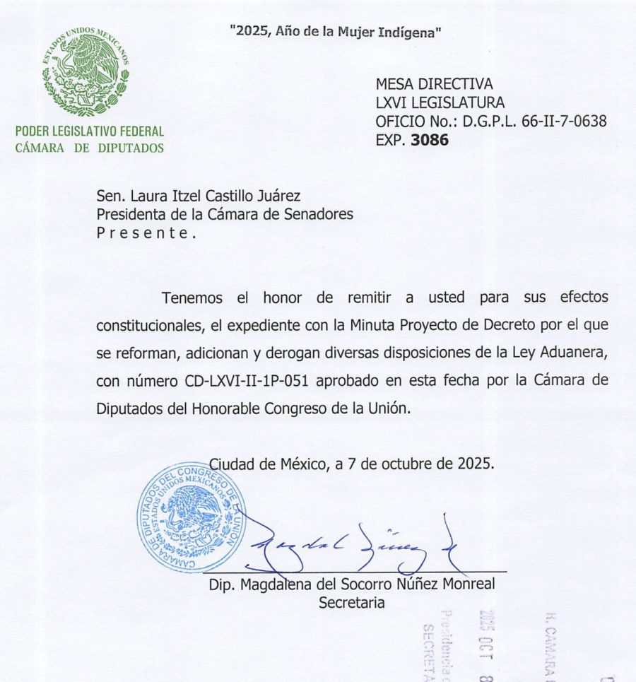 México, 9 de octubre.- La presidenta del Senado de la República, Laura Itzel Castillo Juárez, informó que este órgano legislativo recibió de la Cámara de Diputados la minuta con proyecto de decreto que reforma diversas disposiciones de la Ley Aduanera, cuyo objetivo principal es combatir la evasión fiscal y modernizar los procesos del comercio exterior.