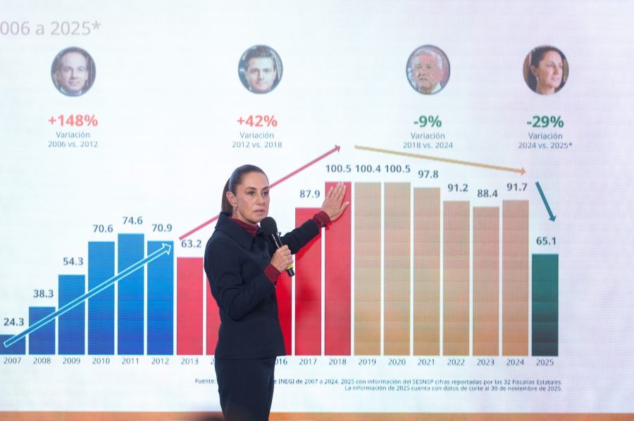 Recordó que, según sus datos, durante los gobiernos de Felipe Calderón y Enrique Peña Nieto la tendencia de homicidios fue al alza, mientras que con López Obrador primero se estabilizó y posteriormente comenzó a descender, tendencia que —dijo— su administración profundiza.