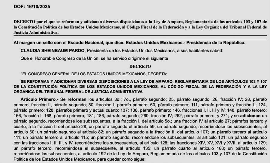 México, 16 de octubre.- La presidenta Claudia Sheinbaum publicó en la edición vespertina del Diario Oficial de la Federación (DOF) el decreto de la Ley de Amparo, la Ley Orgánica del Tribunal Federal de Justicia Administrativa y el Código Fiscal de la Federación, con el objetivo de modernizar los procedimientos judiciales y fiscales, así como garantizar un acceso más eficiente a la justicia.