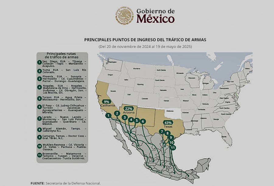 México, 8 de julio.- La Secretaría de la Defensa Nacional (Sedena) identificó a Texas como el principal punto de ingreso del tráfico de armas hacia México, pues concentra el 43 por ciento del flujo ilegal detectado entre el 20 de noviembre de 2024 y el 19 de mayo de 2025, según el Informe Semestral de la Fuerza Armada Permanente en Tareas de Apoyo a la Seguridad Pública, remitido por la Secretaría de Seguridad y Protección Ciudadana (SSPC) a la Comisión Permanente.